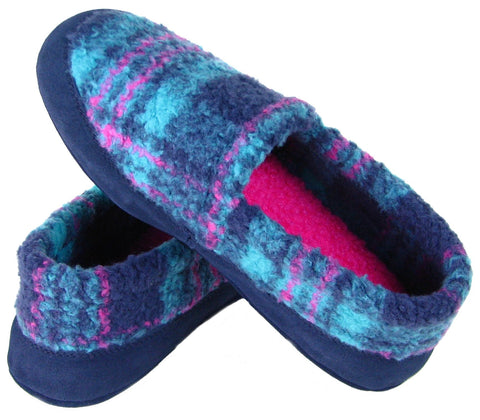 Women's classic mocs slippers in gorgeous jewel tones and a bright pink footbed.